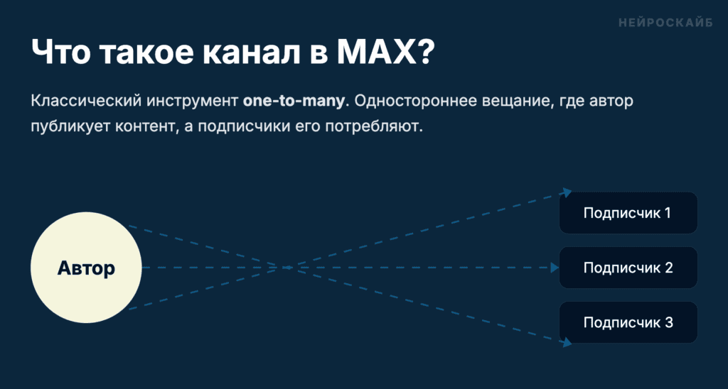 По своей сути каналы в MAX — это классический инструмент «one-to-many» (один говорит — многие слушают). Это одностороннее вещание, где автор публикует контент, а подписчики его потребляют.