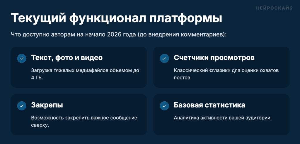 В отличие от групп, где могут писать все участники, канал — это трибуна автора. Комментарии и реакции пока находятся в стадии внедрения (согласно дорожной карте, полноценный запуск этих функций ожидается в ближайших обновлениях).