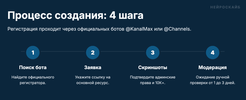 - Создание: После одобрения вам придет уведомление, и в меню мессенджера разблокируется функция создания канала. Название и никнейм часто резервируются автоматически на основе вашей заявки.