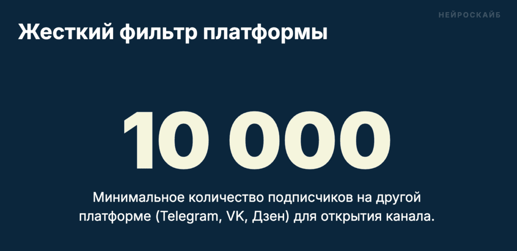 - Аудитория: Минимум 10 000 подписчиков на другой платформе. Принимаются подтверждения из Telegram, ВКонтакте, Яндекс.Дзен или Одноклассников.