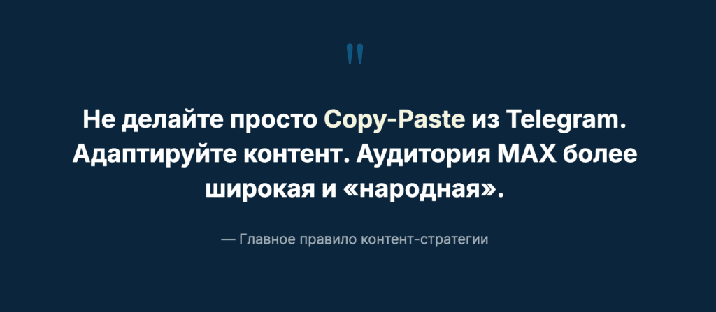 Главное правило: Не делайте просто «Copy-Paste» из Telegram. Адаптируйте контент. Аудитория MAX (благодаря предустановке) более широкая и «народная», чем гики из Telegram.
