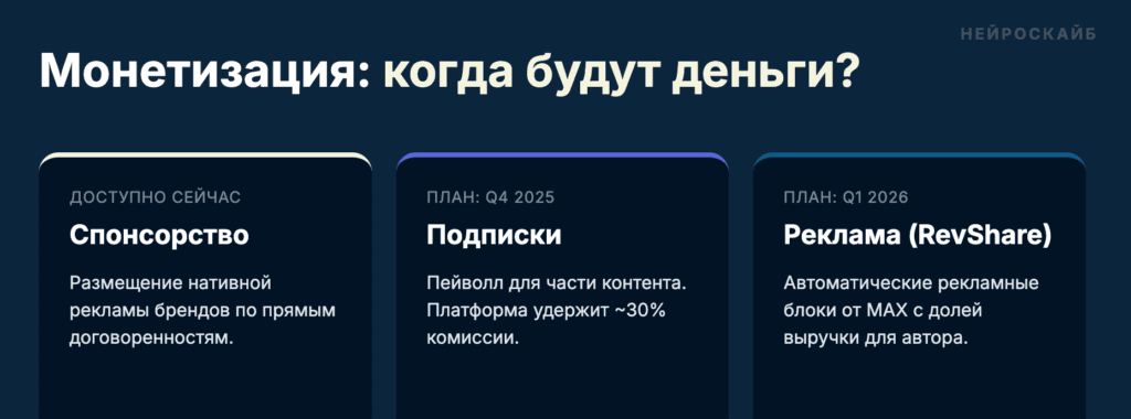 - Механика: MAX будет автоматически размещать рекламные блоки, а автор — получать долю от выручки (Revenue Share).
