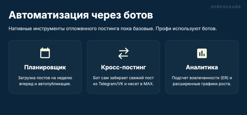 Поскольку нативные инструменты отложенного постинга в MAX пока базовые, профессиональные авторы используют сторонних ботов.