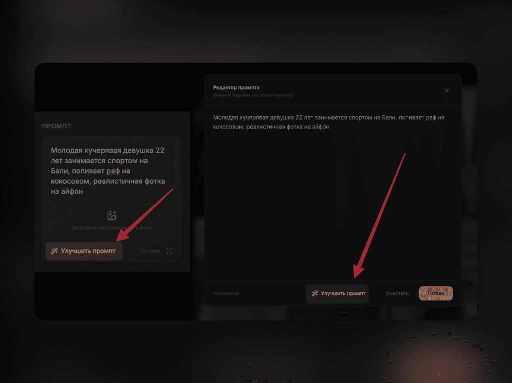 - Нажать «Улучшить промт» — нейросеть сама доработает текст