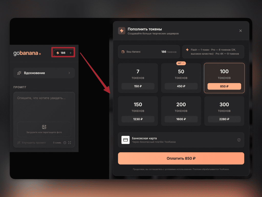 Выбирайте пакет и нажимайте «Оплатить» — вас перекинет на страницу оплаты. Принимаются банковские карты, СБП и ЮMoney. Токены зачислятся в течение нескольких минут.