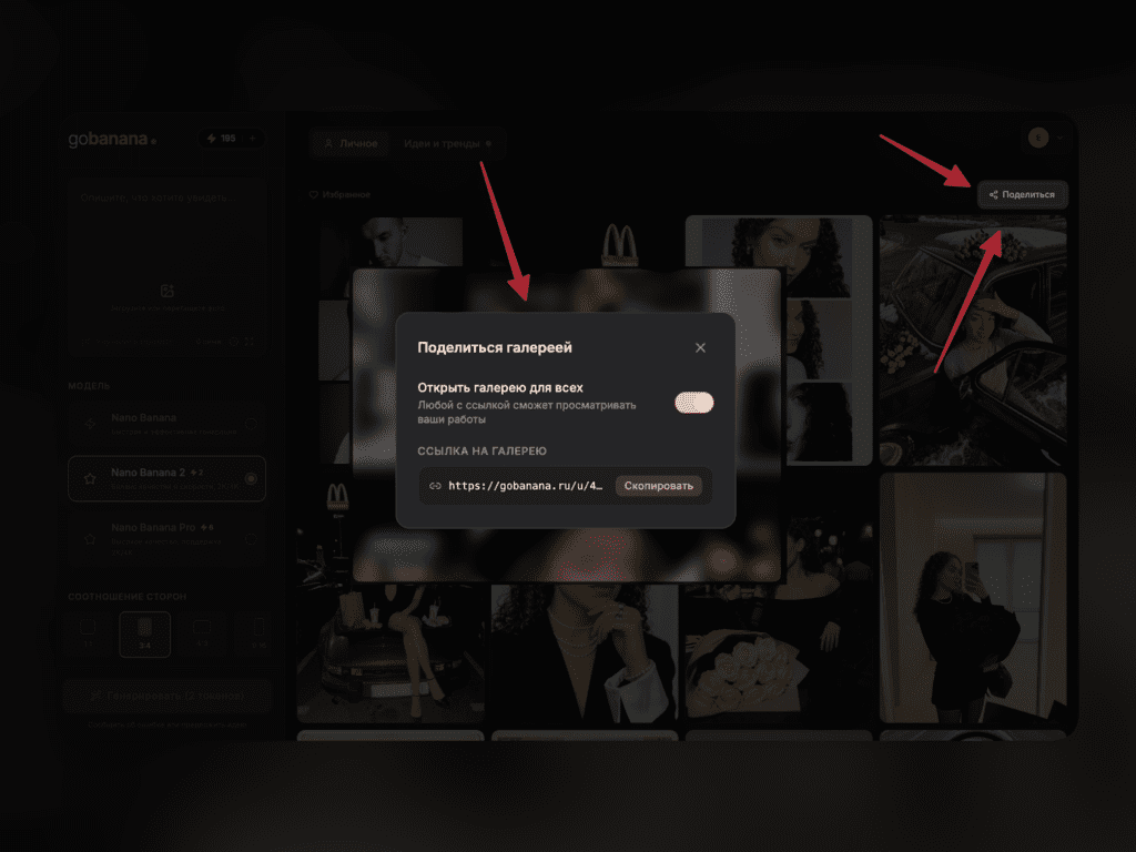 Откроется окно с переключателем «Открыть галерею для всех» — включите его, и вы получите ссылку на свою галерею. Все, у кого будет эта ссылка, смогут посмотреть ваши работы.