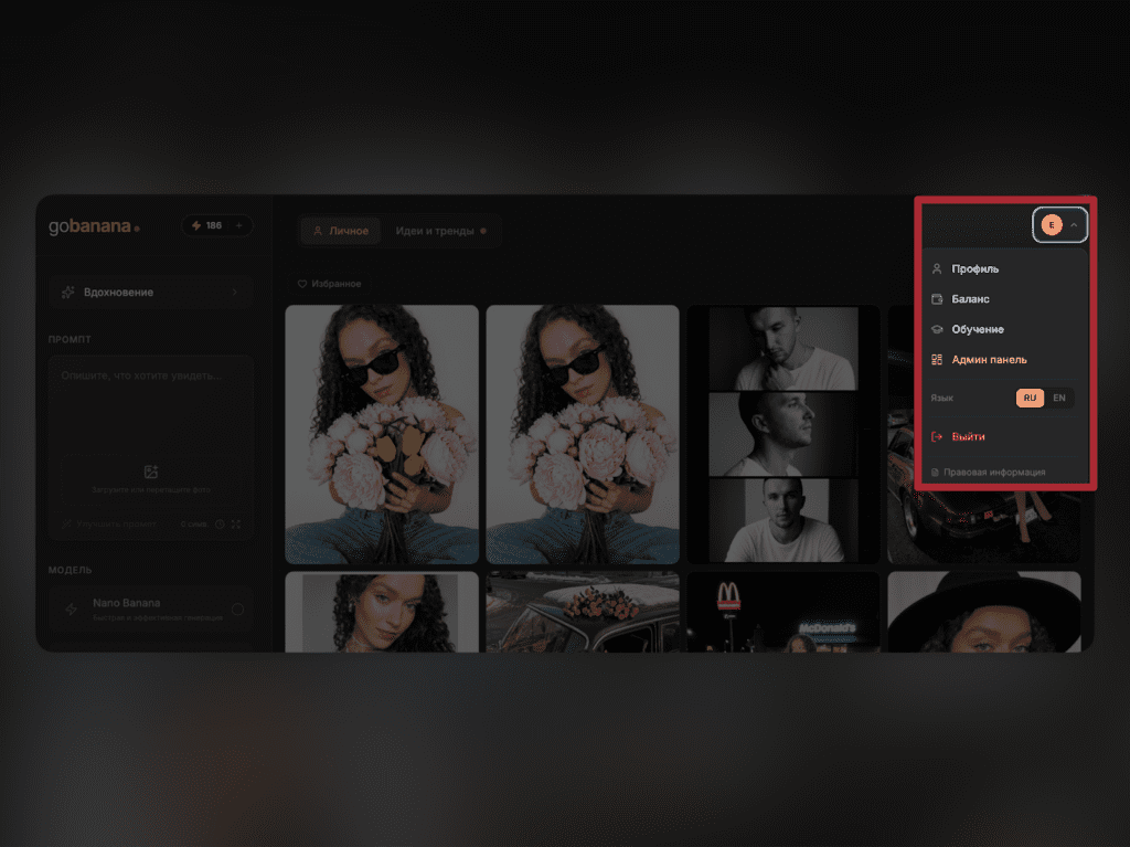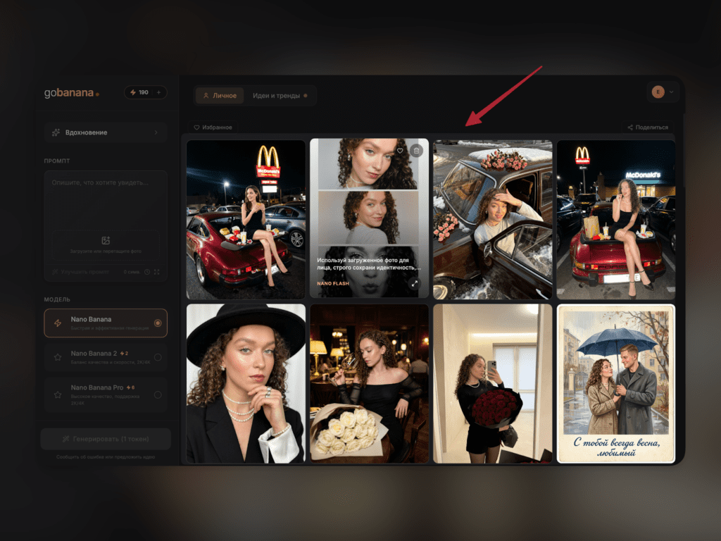 Справа на главном экране — ваша личная галерея. Здесь хранятся все изображения, которые вы когда-либо создали в сервисе.