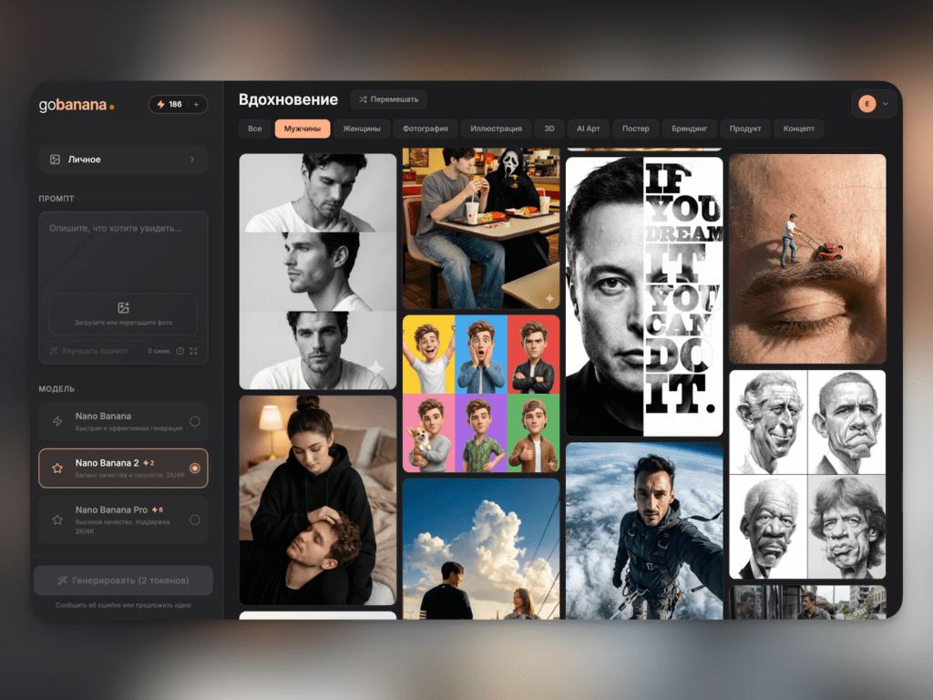 Фильтруйте по категориям: Мужчины, Женщины, Фотография, Иллюстрация, 3D, AI Арт, Постер, Брендинг, Продукт, Концепт. Или нажмите «Перемешать» — и галерея перетасуется случайно. Иногда это лучший способ найти неожиданную идею.