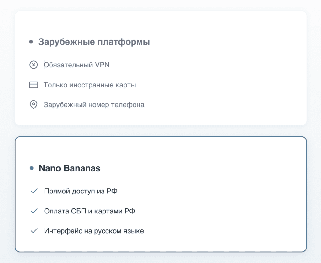 | Параметр | Зарубежные сервисы | Nano Bananas (@nanobananas_bot) |