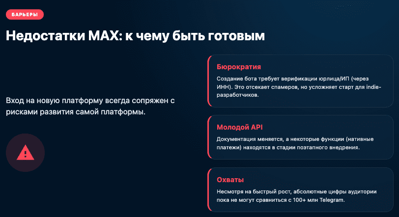 Те, кто создал каналы и ботов в Telegram в 2016 году, сейчас лидеры рынка. MAX дает второй шанс повторить этот успех. Заняв нишу сейчас, вы закрепите за собой лояльную аудиторию до того, как придут крупные игроки.