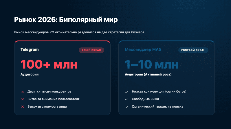 Предприниматели и разработчики встают перед выбором: идти в «Алый океан» Telegram, где за внимание пользователя нужно биться, или нырнуть в «Голубой океан» MAX, где конкуренции почти нет, но и аудитория пока меньше? Давайте сравним цифры, технологии и деньги.