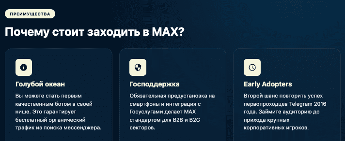 В Telegram в любой нише (от доставки еды до гороскопов) существуют сотни конкурентов. В MAX вы можете стать первым и единственным качественным ботом в своей категории. Это гарантирует органический трафик из поиска. - Государственная поддержка.