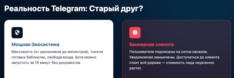 - Баннерная слепота: Пользователи подписаны на сотни каналов и ботов, уведомления часто отключены. Достучаться до клиента стоит дорого (высокая цена за лид).