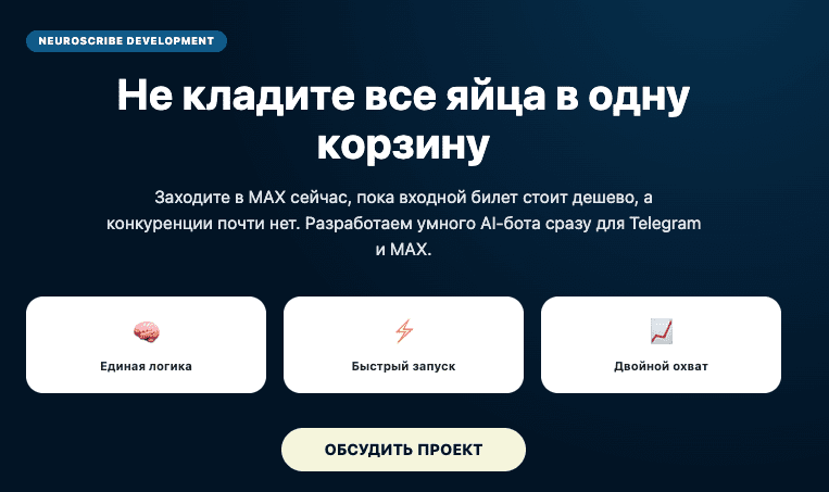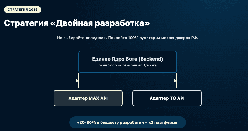 Портирование готового бота из Telegram в MAX занимает всего +20–30% от времени разработки. То есть, заплатив за создание чуть больше, вы получаете присутствие на двух платформах.