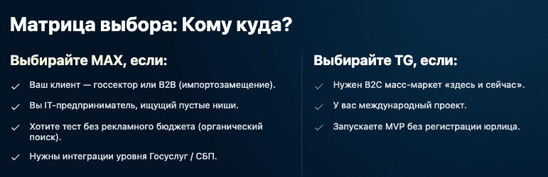 Интеграция с Госуслугами и статус национального мессенджера делают MAX стандартом для B2B и B2G секторов. Если вы работаете с госучреждениями или крупным российским бизнесом, ваше присутствие здесь обязательно. - Ранний вход (Early Adopters).