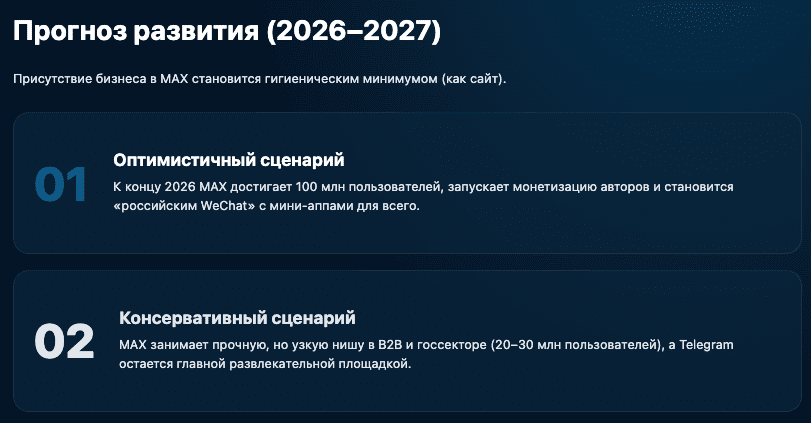 - Оптимистичный: К концу 2026 года MAX достигает 100 млн пользователей, запускает полноценную монетизацию для авторов и становится «российским WeChat» с мини-приложениями для всего.