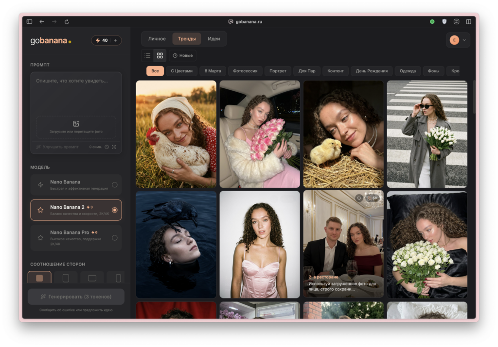Какую модель выбрать для нейрофотосессии? Nano Banana 2 — оптимальный выбор. Скорость высокая, сохранение лица улучшено, стоит 3 токена. Если нужен абсолютный максимум качества — PRO за 6 токенов, но разница на обычных экранах минимальная.