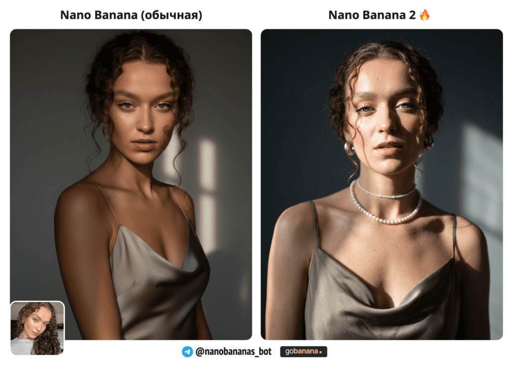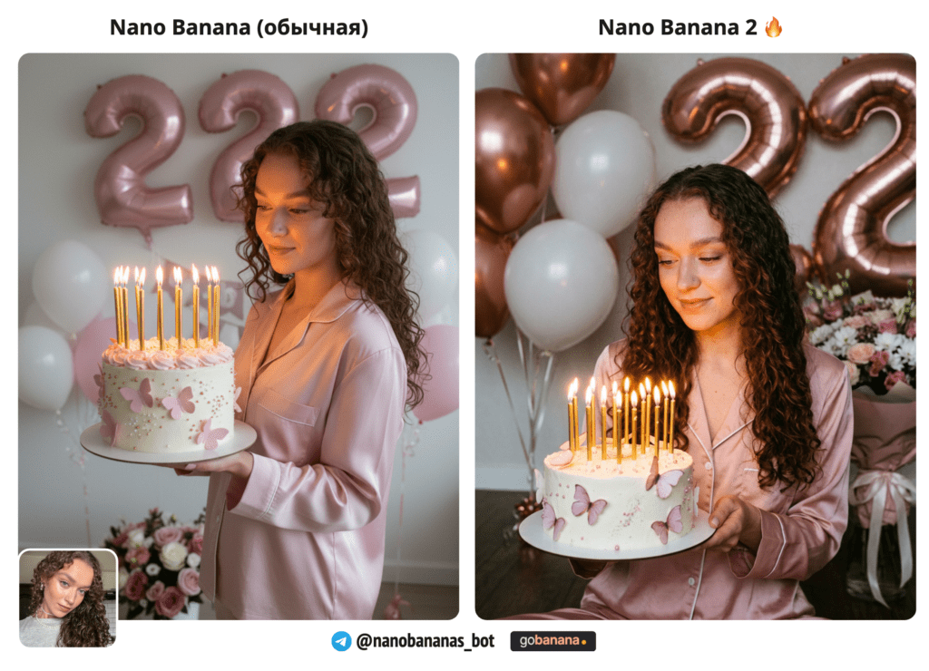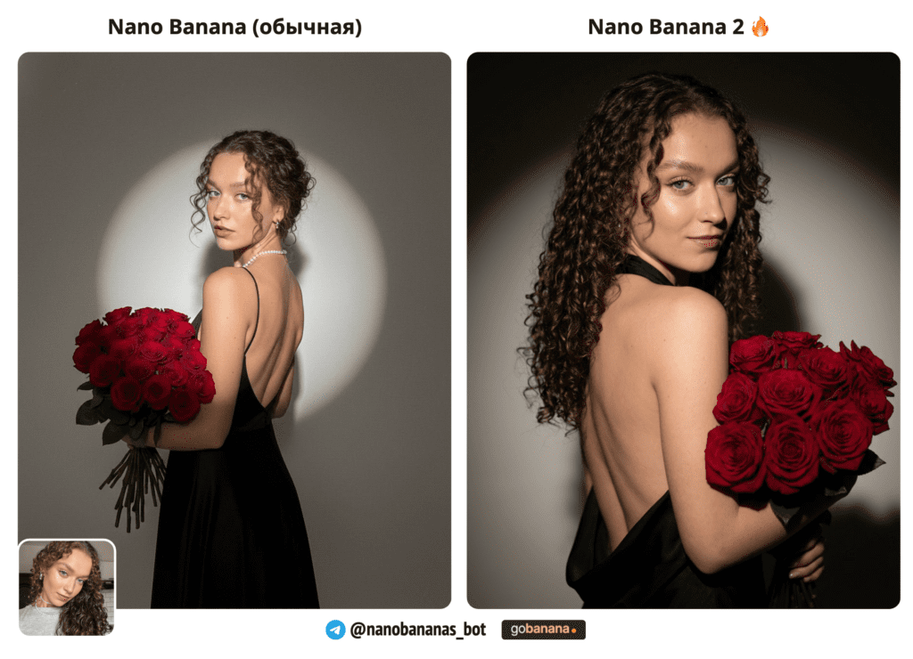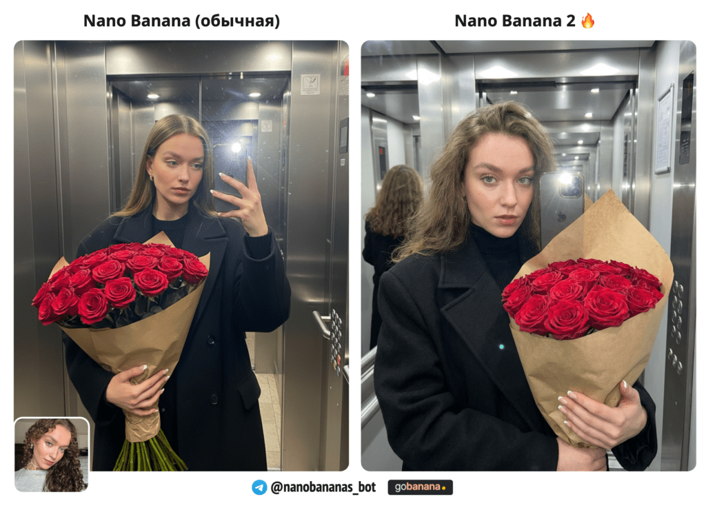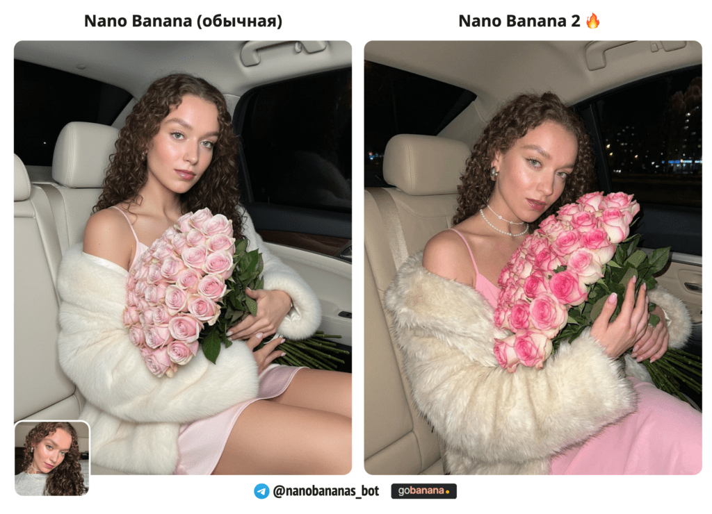 Чтобы разница была понятна не на словах, а на картинках — ниже реальные примеры из нашей галереи. Одни и те же промпты, разные модели. Всё это можно повторить самому: и в боте, и на GoBanana.ru.