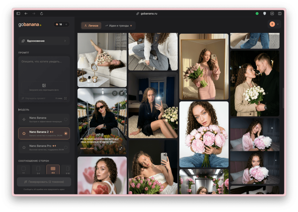 Можно ли делать нейрофотосессию через @nanobananas_bot, а не через сайт? Да. Бот и сайт — одна платформа с общим балансом и аккаунтом. Бот удобен для быстрых задач в Telegram, сайт gobanana.ru — для работы с библиотекой промптов, галереей и редактором с маской.